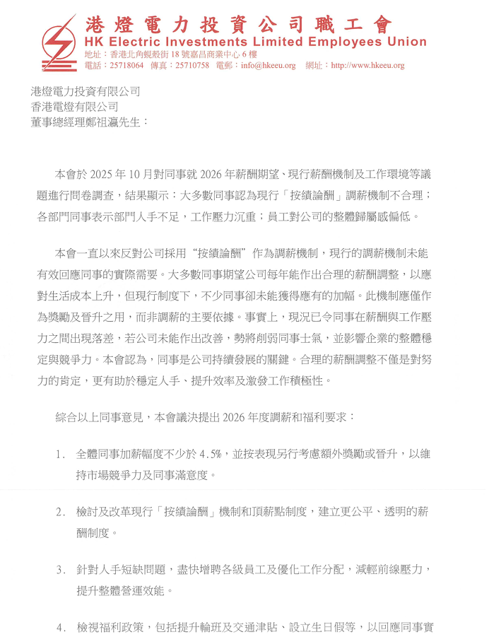 感謝各位會員及同事就早前調薪問卷調查踴躍發表意見。綜合員工意見要求,經執委咨詢會議決於10月下旬就2026年度調薪要求致函公司,全文如下: